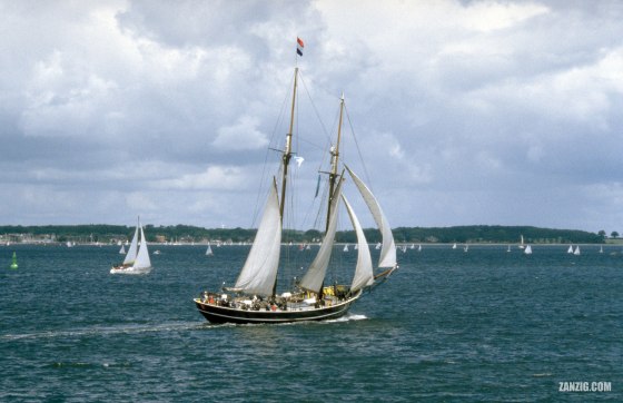 JUNE 1999 – The Schoner Ide Min from the Netherlands sails on the Baltic Sea in Kiel, Germany. © Mark … More