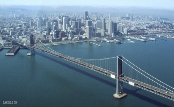 SEPTEMBER 2003 – Aerial view across the Oakland Bay Bridge and downtown San Francisco, California. Photo © Mark Zanzig/zanzig.com
