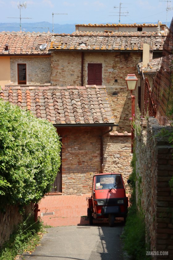 MAY 2023 – A red Piaggio Ape 50 has been parked in San Gimignano, Tuscany, Italy. © Mark Zanzig/zanzig.com