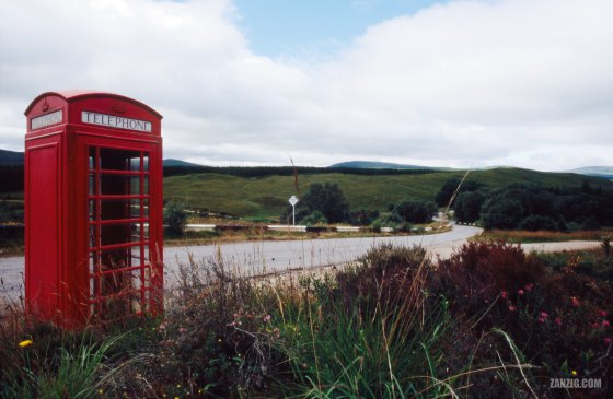 JULY 2005 – A lonely phonebox on the A837 in the Scottish Highlands, near Oykel Bridge, Scotland. © Mark Zanzig/zanzig.com