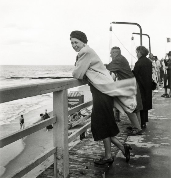 SUMMER 1943 – On a windy day, Edith Schweim (1905-1966) poses for a photo at the beach promenade in St.-Peter-Ording … More