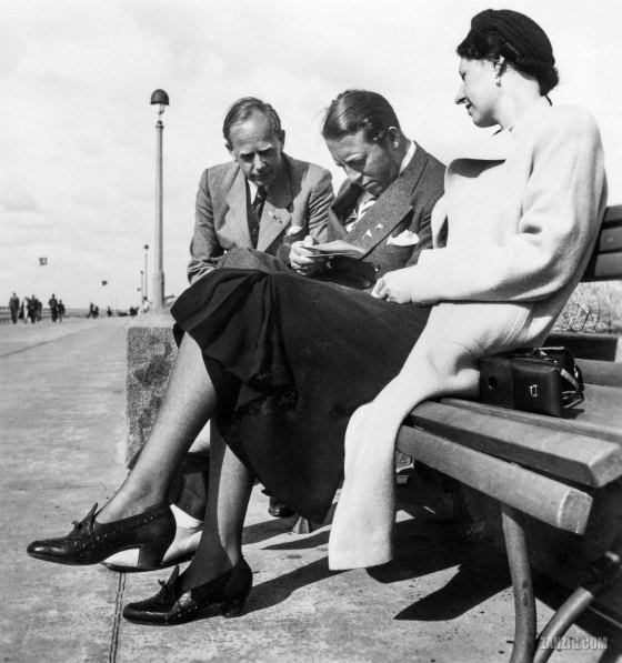 1943 – Otto Schweim (left), Arthur Wilke (center), and Edith Schweim sit at the promenade of St. Peter Ording in … More