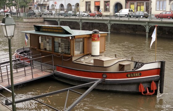 2001 – The ticket office for boat trips and sightseeing tours rests on the retired tug boat Marne in Strabourg, … More