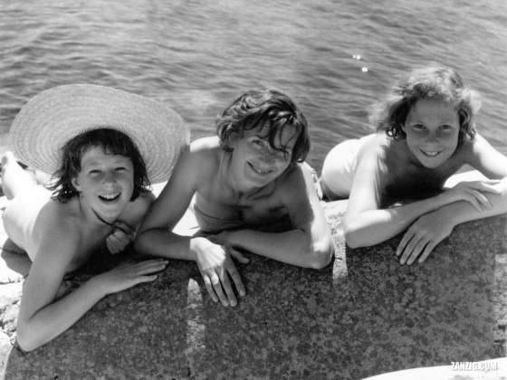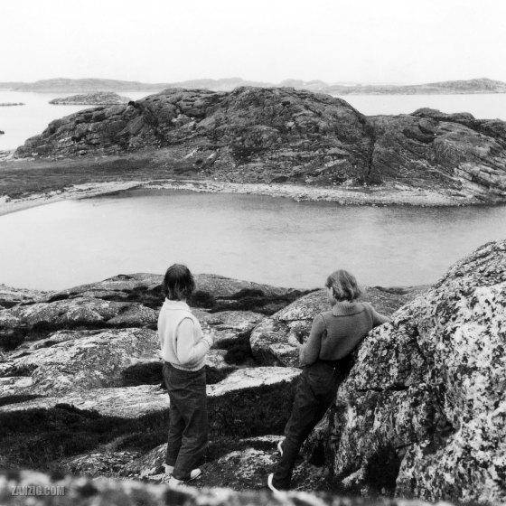 SUMMER 1954 – Two girls and a lady pose for the photographer on rocks near Lysekil, Sweden. © Mark Zanzig/zanzig.com