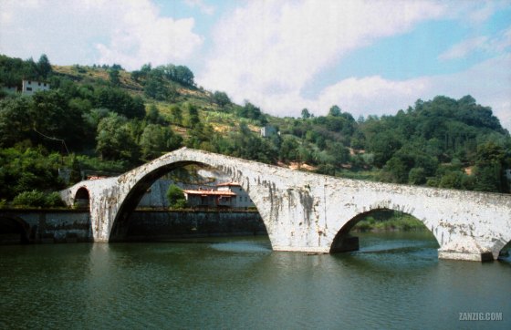AUGUST 2000 – The medieval Ponte della Maddalena over the river Serchio in Borgo a Mozzano, Italy. Photo © Mark … More