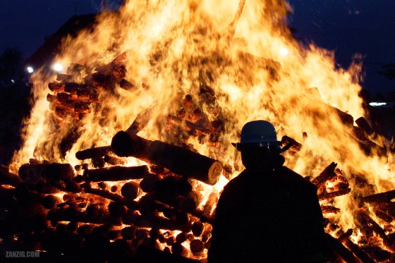 JUNE 2004 – A fireman gazes at a giant fire made from stacked wood that burns brightly during a midsummer … More