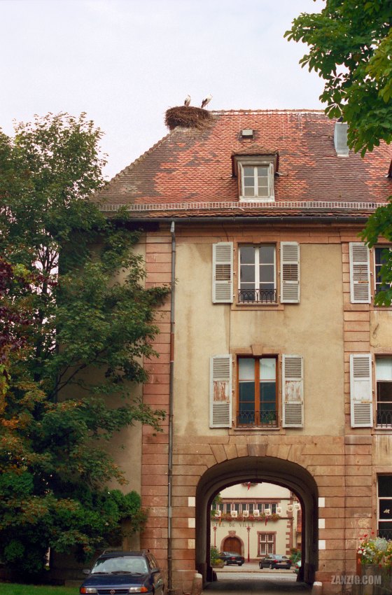 SEPTEMBER 2001 – Two storks stand in their nest on a roof in Munster, Alsace, France. © Mark Zanzig/zanzig.com