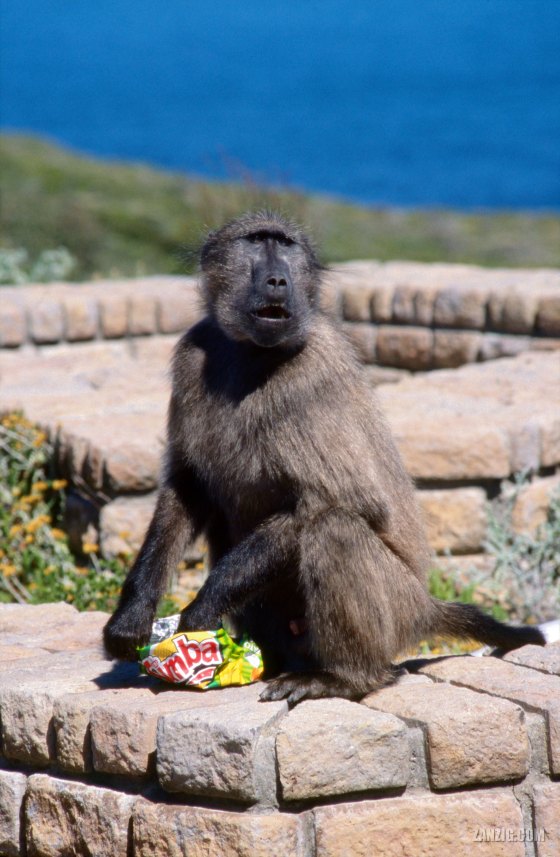 MARCH 2004 – A male chacma baboon (Papio ursinus) enjoys the chips stolen from a tourist at the Cape of … More
