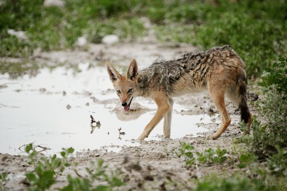 NOVEMBER 2006 – A blackbacked jackal observes his surroundings while drinking from a puddle at the Etosha National Park in … More