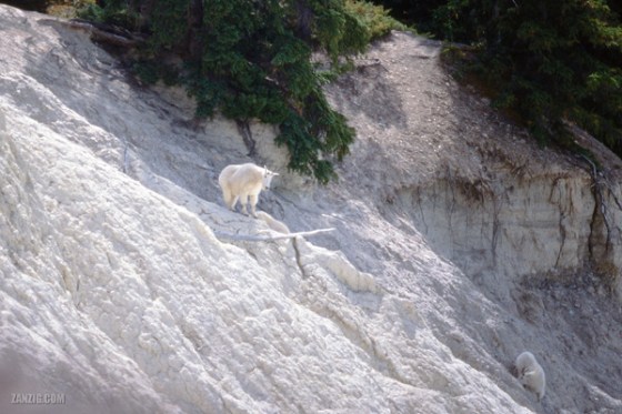 AUGUST 2002 – Two wild and free white mountain goats descend some bright white rocks of the Canadian Rocky Mountains … More
